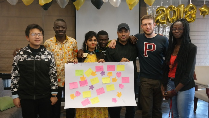 Another common activity from all the countries is making a list of new wishes to be fulfilled in the coming year, so we make some groups and wrote a banner with our dreams, wishes, and hoped-for accomplishments for the next year. To provide some entertainment, many students showed their talents and how gifted they are. Assem (Tajikistan), Solomon (Uganda), Increase (Nigeria), and Zahid (Bangladesh) entertained us through songs. Nilima and Konok (Bangladesh) and Victor (Ghana) showed traditional dancing from their countries.