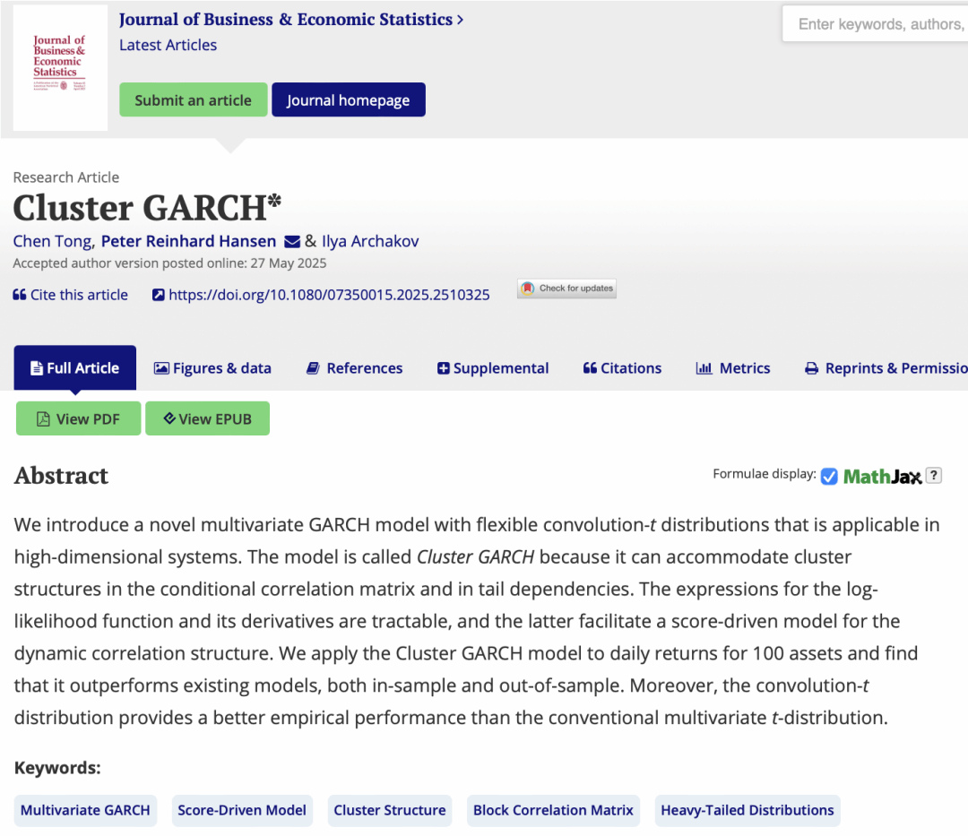 Recently, a collaborative paper titled “Cluster GARCH” by Associate Professor Chen Tong from Xiamen University (XMU), in collaboration with Professor Peter Reinhard Hansen from the University of North Carolina at Chapel Hill and Assistant Professor Ilya Archakov from York University in Canada, has been officially accepted and published online by the Journal of Business & Economic Statistics (JBES), an internationally renowned journal in statistics and econometrics. The journal is recognized as an international Class A journal by XMU College of Economics according to the college’s own tiered journal ranking list.