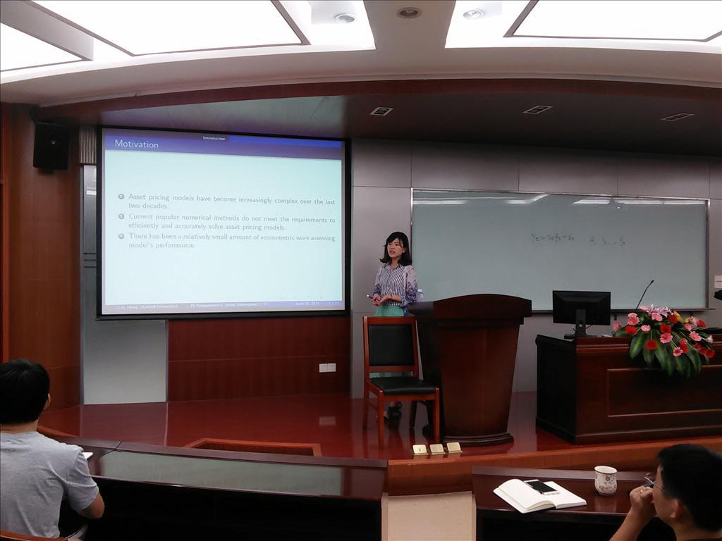 然后,崔丽媛学姐报告了她的论文:“Solving Asset Pricing Models Using Instrumental Variable Nonparametric Series Estimations”。由于动态随机一般均衡模型通常没有解析或封闭形式的解,模型的有效性取决于近似函数的优良程度,虽然被广泛应用,但在统计上没有健全的估计方法。于是崔丽媛学姐研究特定情况下存在解析解的资产定价模型,以解析解作为对比,使用工具变量非参估计方法研究有限样本下模型的表现情况。虽然论文既有计量模型推导,也有实际模型应用,但是崔丽媛学姐仍然十分感激陈海强老师提出的问题和建议。