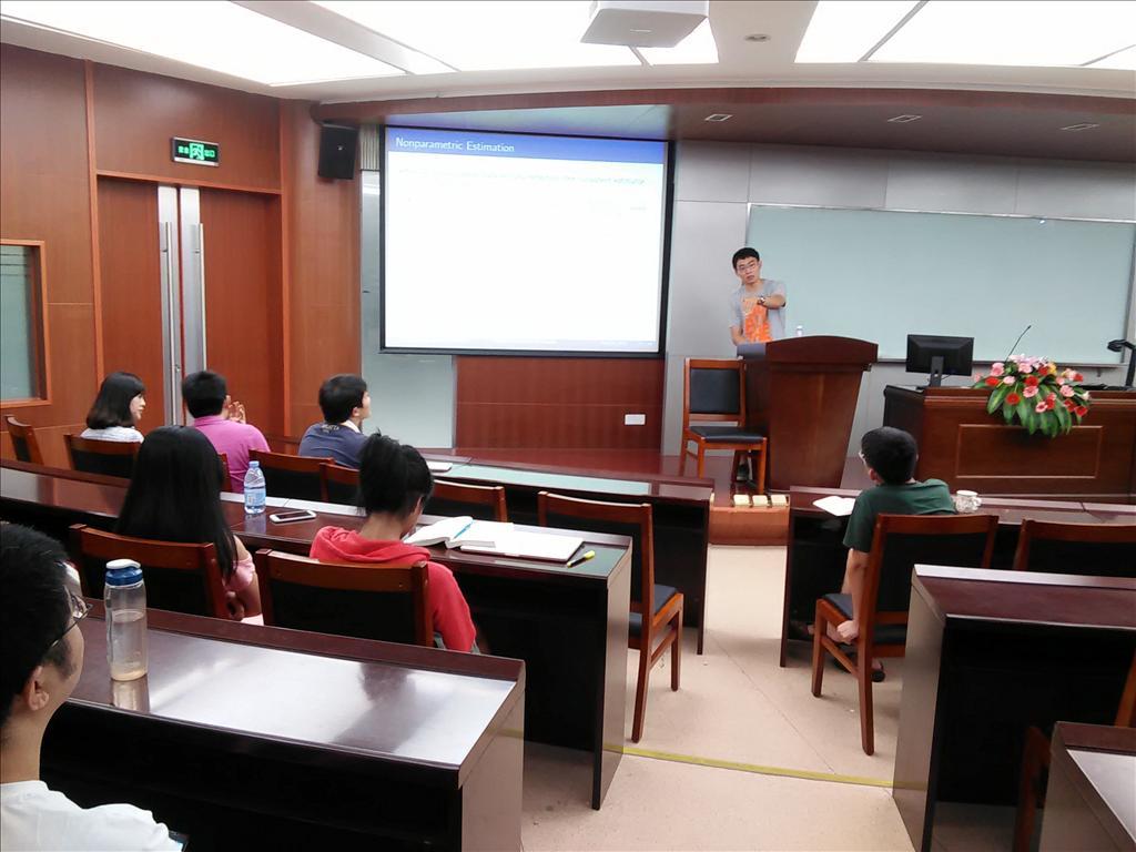首先,付中昊学长介绍了他的研究:“Testing for Spurious Nonlinearity Caused by Structural Change in Nonparametric Regression Models”,该研究认为很多非线性时间序列模型回归后失去准确的预测性的原因是回归模型平滑结构或者不连续结构随时间的改变导致了伪非线性回归问题,付中昊学长构建了一个非参数检验以区分经济问题里伪非线性模型和真实的非线性模型,通过傅里叶转换把数据产生过程分为两个维度:捕捉解释变量和非解释变量之间线性或非线性关系的频率域,和捕捉由结构变化和结构破坏导致的伪非线性关系的单时间域,因此可以通过检验函数关系相应的傅里叶变换的不稳定性来检验未知函数关系的实时变性。付中昊学长一边根据论文思路做报告,一边对同学们提出的问题给予详细解答。论文讲解完毕,陈海强老师高度肯定了论文的质量,并建议付中昊学长将这一计量模型结合实际经济学问题以进一步提高论文的实用性和认可度。