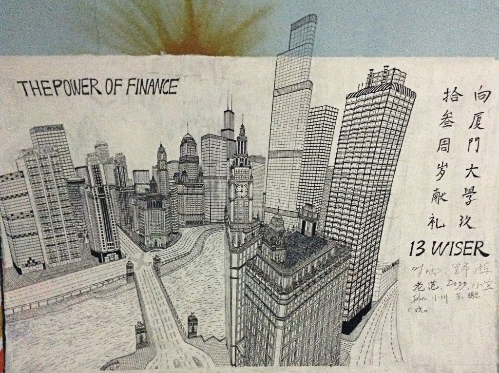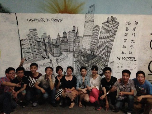 2014年4月19日晚,历经两天的工作,王亚南经济研究院(WISE)2013级的画家姜时雨同学与本院的其他同学共同创作完成了名为“THE POWER OF FINANCE”的芙蓉涂鸦。壁画所绘制的是学子们尤其是经院(亚南院)学子们极度向往的芝加哥期权交易中心(CBOE)。该作品不仅表达了同学们对金融的热爱,也作为献礼庆祝福厦门大学九十三周岁生日快乐。涂鸦完成之后,WISE的同学们争前恐后地与姜同学的作品合影。