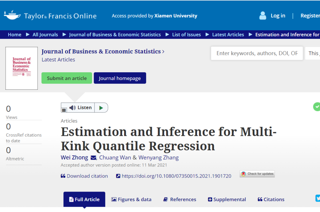 首先,作者提出了一种迭代自助重启算法(BRISQ)用于同时估计回归系数和变点位置。该算法比传统的网格搜索法更加有效,且不依赖初始值的选择。其次,作者建立了参数估计的渐近正态分布以及变点选择的相合性,理论研究表明变点参数和回归系数具有联合渐近正态分布性质。最后,作者基于次导数提出一种得分检验统计量用于检测变点的存在性,并针对变点参数构建秩得分型置信区间。模拟实验结果和两个实际案例分析表明该文方法具有良好的有限样本表现。此外,作者还开发一个新的R软件包MultiKink来实现该文的方法。