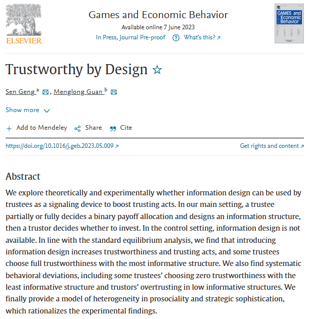 近日,WISE耿森副教授与加利福尼亚大学圣芭芭拉分校博士生(WISE 2017届本科国际化试验班毕业生)关梦龙合作完成的论文“Trustworthy by Design”在线发表于博弈论领域国际顶尖期刊Games and Economic Behavior,该刊是厦大经济学科认定的国际A类期刊。