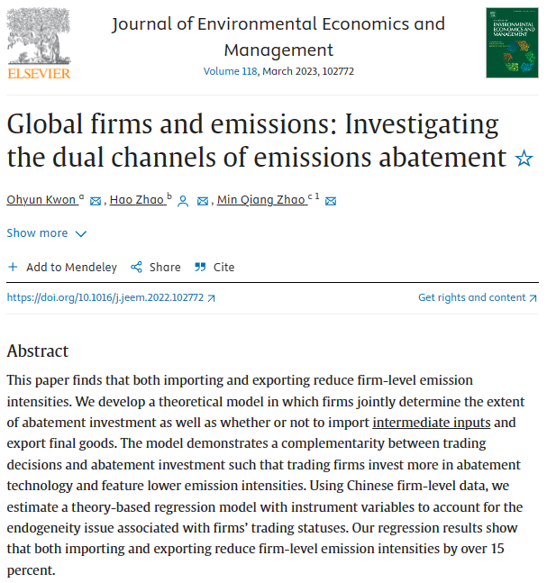 近日,WISE赵敏强副教授与德雷塞尔大学Ohyun Kwon助理教授、中国人民大学赵浩助理教授合作的题为“Global Firms and Emissions: Investigating the Dual Channels of Emissions Abatement”的论文发表在Journal of Environmental Economics and Management 2023年第118卷,该刊是厦大经济学科认定的国际A类期刊。