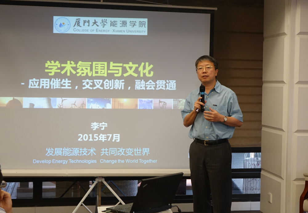 能源学院李宁院长做了题为《学术氛围与文化——应用催生、交叉创新、融会贯通》的演讲,他提到,先要做正确的事,再正确地做事,高校要提高和鼓励创新,注重交流与实践,鼓励学科交叉,注重产、学、研结合与发展。