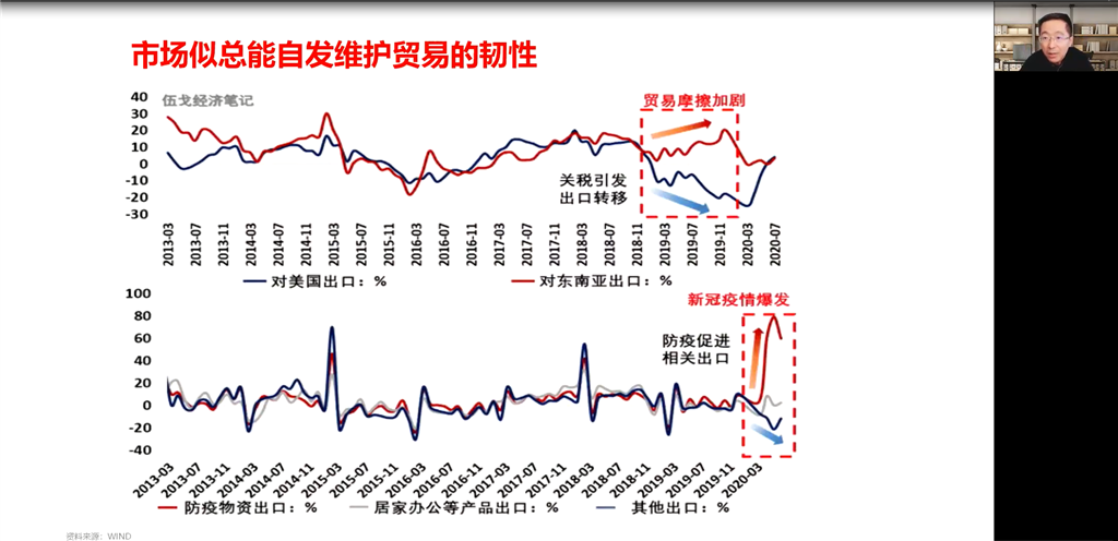 其次,伍戈博士简要介绍了中国经济形势的变化,如消费、进出口和投资的比重不断下降,但出口是内销的先行因素,对外贸易依然十分重要。进一步介绍了中国出口的目的地、变动趋势、特征,以及当前全球经济形势,并指出中国出口具有较强韧性,市场调节可以自动稳定在外部冲击下的中国对外贸易发展。同时,从产业的齐全性和技术复杂度的情况分析了中国生产能力,从零售市场发展介绍了中国需求变动,从外商直接投资的角度分析了中国投资的发展情况和前景。接着,伍戈博士介绍了中国国内“内循环”的情况,分析了疫情下中国的消费变动规律及其原因,服务业和投资增速的变动趋势,并对服务业消费的修复和变化进行了预测。
