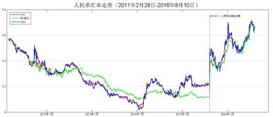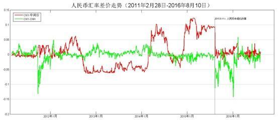 如图1示,8.11汇改当天人民币中间价一次性贬值超过千点,在岸人民币汇率(CNY)和离岸人民币汇率(CNH)跟随中间价一次性贬值近2%, 之后三个人民币汇率都经历了波澜起伏的一年,双向波动幅度加大,贬值趋势也明显增大。如图2示,8.11汇改前,在岸人民币交易价(CNY)相对中间价的上下偏离(图中红线)较大,汇改后趋于收敛,说明中间价的基准地位得到增强;在岸人民币汇率(CNY)和离岸人民币汇率(CNH)的差价(图中绿线)在汇改后的一段时间有所加大,市场贬值预期强化, 进入2016年以来,境内外汇率差价缩小, 一定程度反映了人民币汇率预期的改善,并抑制了跨市场套利。