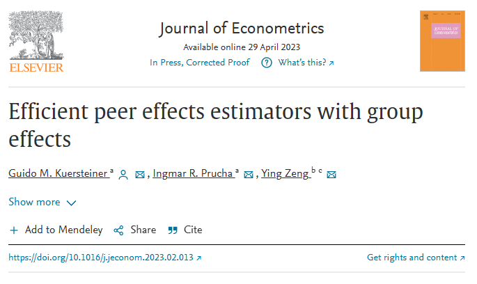 近日,厦大经济学院财政系、王亚南经济研究院助理教授曾颖与美国马里兰大学帕克校区Guido M. Kuersteiner、Ingmar R. Prucha合作完成的论文“Efficient peer effects estimators with group effects”在计量经济学国际顶尖期刊Journal of Econometrics在线发表,该刊为厦大经济学科认定的A类期刊。
