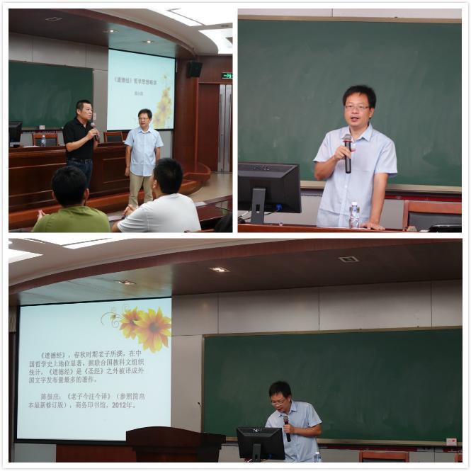 接着,黄教授分五个部分讲述了《道德经》的哲学思想。其中第一部分题为“万物之宗象帝之先”,在这一部分黄教授细分三个小节分别介绍了道的本体性,道的其他属性和道化生万物的过程。第二部分题为“清静为天下正”,向学生们阐述了《道德经》里面所主张的治国思想和用兵理念。第三部分题为 “道生德蓄独异于人”,黄教授给学生们讲述了老子所主张的为人之道。第四部分题为“去此取彼与物反矣”,这一部分黄教授引用了《道德经》里的两句话“五色令人目盲;五音令人耳聋;五味令人口爽;驰骋畋猎,令人心发狂;难得之货,令人行妨。是以圣人为腹不为目,故去彼取此。” “塞其兑,闭其门,终身不勤。开其兑,济其事,终身不救。”以此来显示老子希望世人节制欲望,安贫乐道的观点。
