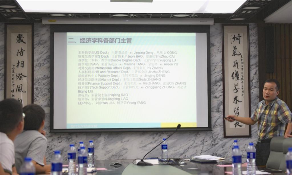 欢迎会的最后环节,学院行政相关部门的各个负责人对各部门做了简要介绍,包括宣传、人事、科研、财务、出国出境、讲座、本科教学、硕博士生教学、留学项目、EDP项目、短训项目、技术支持、部重室及省重室相关等内容。