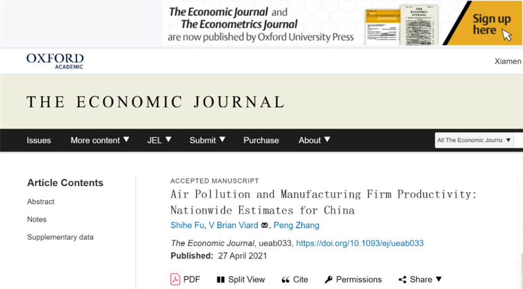 近日,厦门大学经济学院经济研究所与邹至庄经济研究中心傅十和教授以第一作者身份完成的学术论文“Air Pollution and Manufacturing Firm Productivity: Nationwide Estimates for China”在经济学顶级期刊之一The Economic Journal正式刊出。合作者分别为长江商学院的V. Brian Viard 副教授和香港中文大学(深圳)的张鹏助理教授。该成果是国家自然科学基金基础科学中心项目重要阶段性成果之一。
