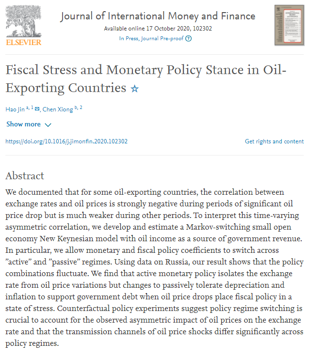 该文指出在油价大幅下跌时期,一些石油出口国的汇率与石油价格呈现出很强的负相关性,但在其他时期则不会。为了解释这个时变的非对称相关性,作者构建并估计了一个小型开放经济新凯恩斯模型,将石油收入纳入到了财政预算中,并假设货币政策可以选择是否稳定汇率波动,而财政政策可以选择是否保持债务稳定,且两种政策能够在不同政策区制中进行马尔科夫转换。在使用俄罗斯数据对模型进行估计后,结果显示平时货币政策会通过稳定汇率来削弱国际石油价格变化对本国经济的冲击,但在石油价格大幅下跌时期,货币政策会允许汇率贬值和通货膨胀上升,通过改变政府支出与收入的相对价值和稀释政府债务实际存量的方式来缓解财政压力。反事实政策模拟发现,货币和财政政策的区制转换对于解释石油价格波动对汇率产生的非对称效果具有关键作用,并且显著改变了油价变化对石油出口国经济影响的传导渠道。