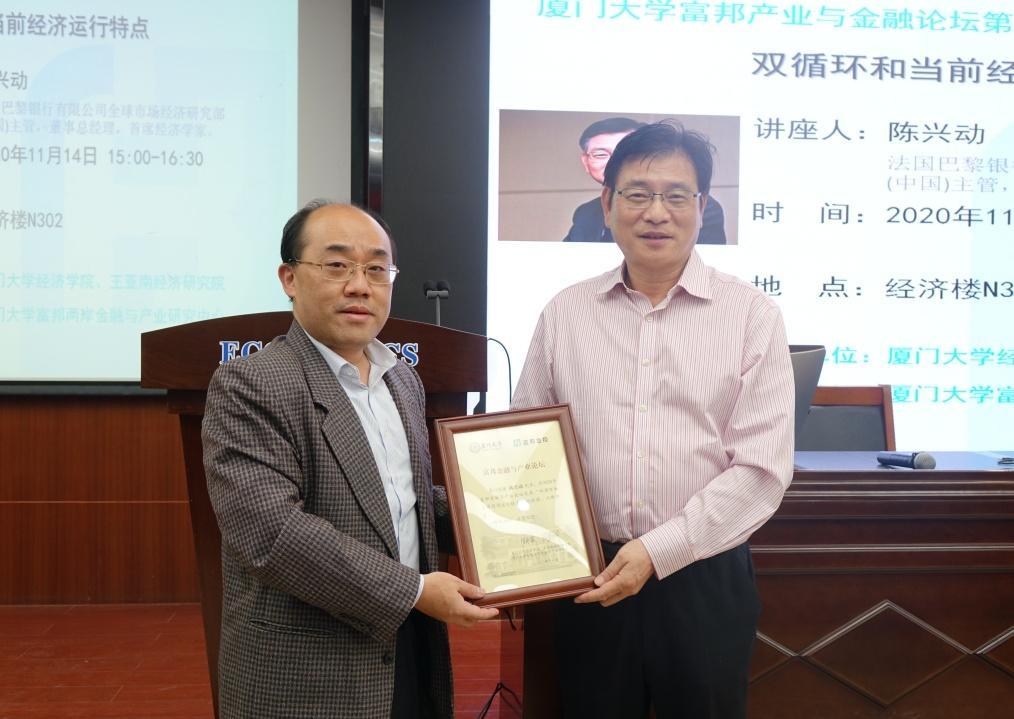11月14日下午,法国巴黎银行有限公司全球市场经济研究部(中国)主管,董事总经理,首席经济学家陈兴动作客厦大富邦金融与产业论坛第46讲,就当前经济运行特点等问题带来精彩报告。周颖刚教授主持讲座并为演讲嘉宾颁发讲座纪念牌。