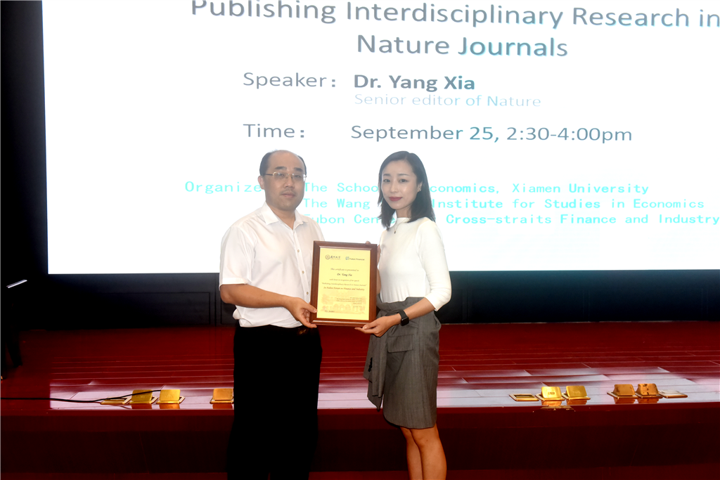 9月25日下午,自然杂志高级学术编辑、英国东安吉利亚大学生态经济学博士夏玚做客厦大富邦金融与产业论坛,带来了一场题为“《自然》及《自然通讯》期刊概览及交叉研究, 顶刊写作发文技巧”的讲座,WISE副院长周颖刚教授主持讲座并为演讲嘉宾颁发讲座纪念牌。讲座后,夏玚与厦大经济学科师生在经济楼N501进行了一场小型研讨会。