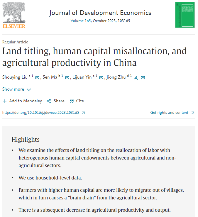 近日,厦门大学经济学院与王亚南经济研究院(WISE)朱炯助理教授与中国人民大学刘守英教授,暨南大学马森助理教授和辽宁大学殷立娟助理教授合作完成的论文“Land titling, human capital misallocation, and agricultural productivity in China”正式发表于发展经济学顶级刊物Journal of Development Economics,该刊也是厦大经济学科认定的国际A类期刊。该文是国家自然科学基金“计量建模与经济政策研究”基础科学中心项目阶段性成果之一。