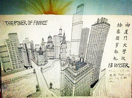 2014年4月19日晚,由王亚南经济研究院(WISE)2013级硕士生姜时雨同学与本院的其他同学历时两天共同创作的主题为“The Power of Finance”的芙蓉隧道涂鸦作品正式完成。本次绘画是同学们利用紧张繁忙的学习的课余时间加班加点完成的杰作。壁画所绘制的是经济类学子们极度向往的芝加哥期权交易中心(CBOE)。该作品不仅表达了同学们对经济金融学科的热爱,也作为献礼祝福厦门大学九十三周岁生日快乐。