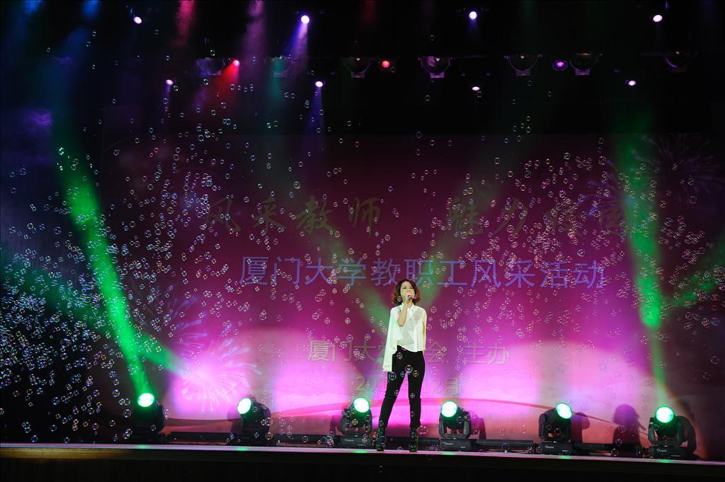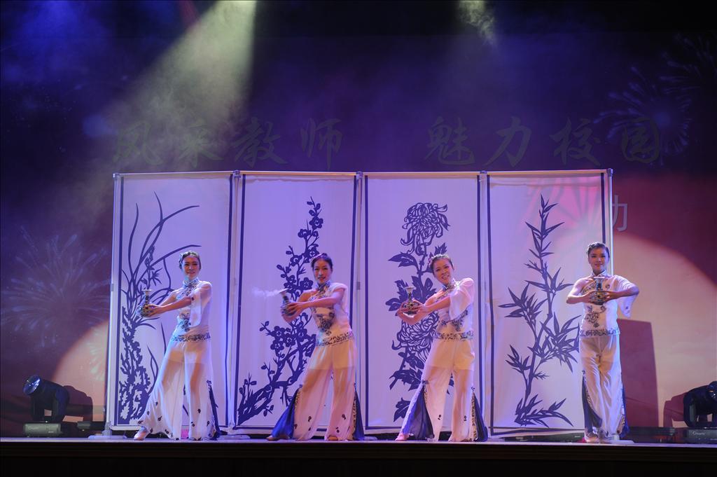 宋阳、黄诗娴、张蕾、夏钦颖演绎的原创舞蹈《青花韵》带有浓郁的中国风,从行云流水的出场到如影如幻的屏风对舞,从整齐划一的动作到别出心裁的桥段设计,四位老师配合极为默契,表现出了良好的团队精神。舞蹈一气呵成,整个会堂为之起了阵阵的欢呼和喝彩。“是否找个借口继续苟活/或是展翅高飞保持愤怒/我该如何存在”,庄佳盈老师磁性的低音和完美的高音,完美展现了《存在》这首歌曲想要提醒人们在纷杂世界里要懂得思考存在的意义以及如何存在的内涵。