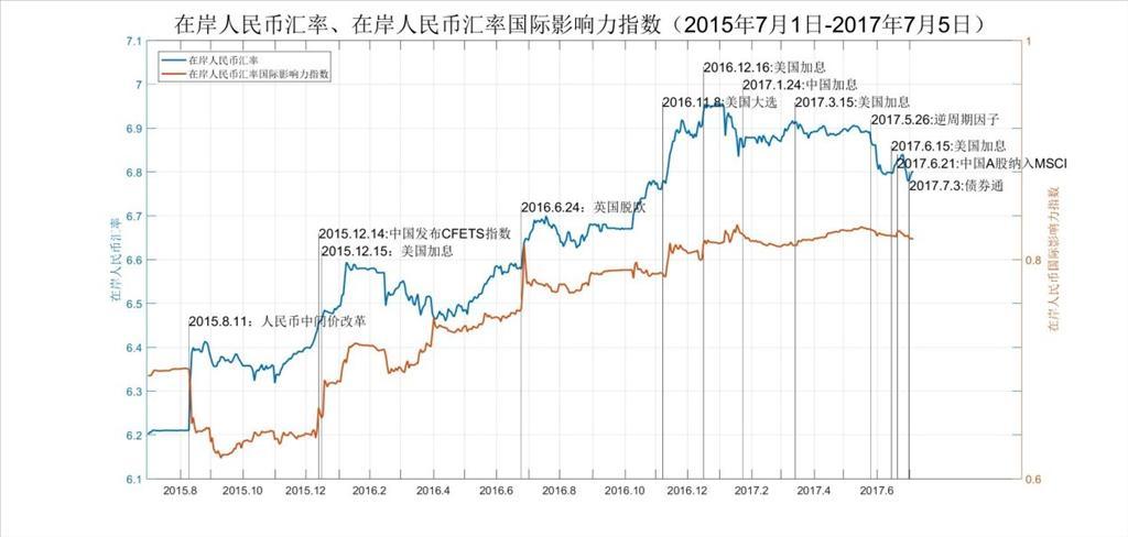 2017年5月26日,央行在人民币对美元中间价的形成机制公式中加入“逆周期因子”后,人民币短期内升值的态势明显。厦门大学经济学科编制的人民币汇率国际影响力指数显示,自引入逆周期因子一个多月以来,人民币汇率的国际影响保持相对稳定,如图1示。