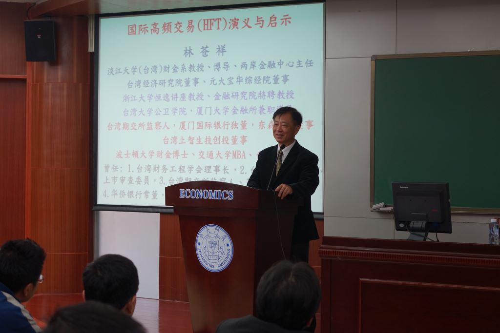 2016年4月18日,台湾淡江大学教授、两岸金融中心主任,林苍祥到访厦门大学经济学科,与两院师生座谈并做了做了一场题为“国际高频交易演义与启示”的学术讲座。