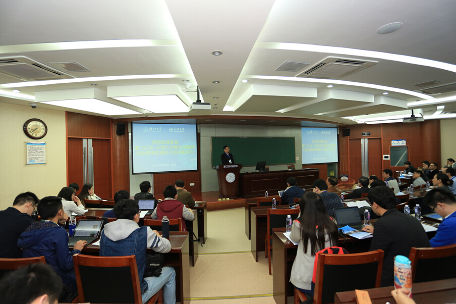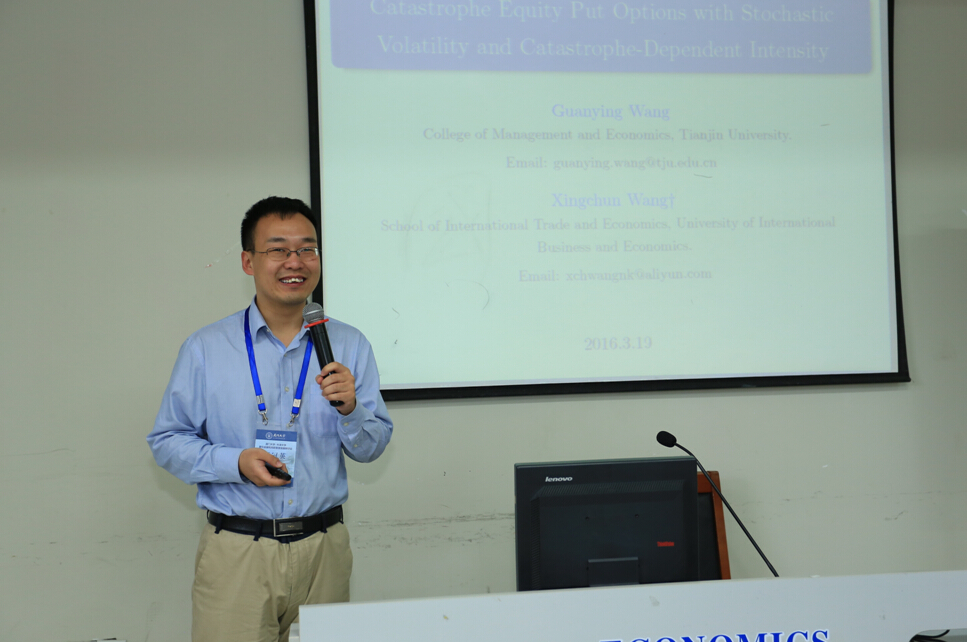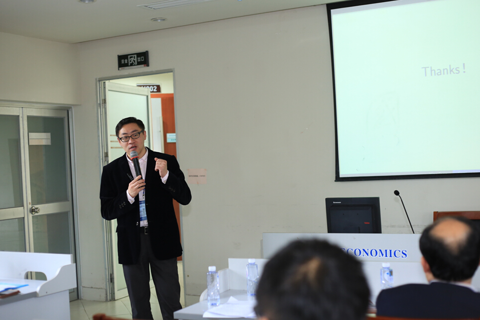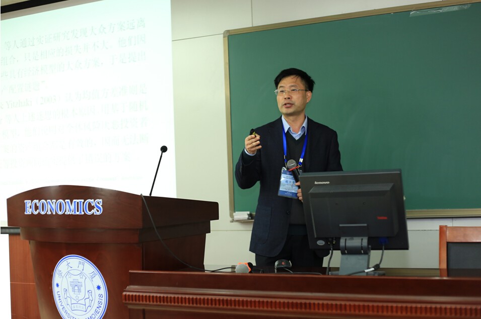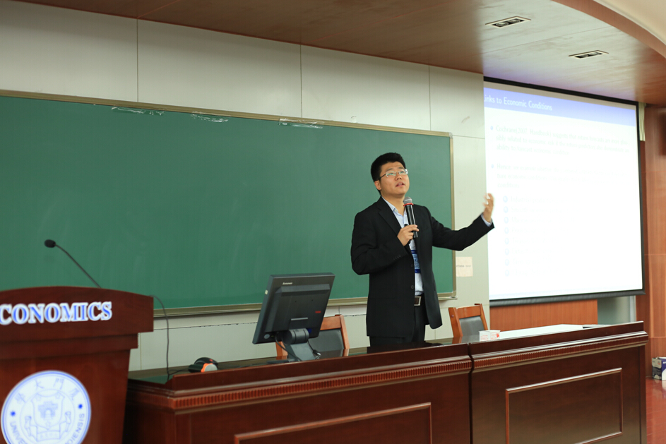 第二分会场的报告主题为“金融计量”,由厦门大学方颖教授主持。第一位报告的是来自天津大学的王冠英教授,他的研究主题是巨灾股票看跌期权,他先简要介绍了巨灾期权的运行机制,其论文的创新点是将‘随时间推移人们对巨灾的期望强度降低’这个因素加入到巨灾期权的定价中;第二位上台展示的是天津大学的博士生吕振威,研究的内容是投资者情绪和IPO市场异象,他通过研究得出的结论是投资申购者的情绪越高,发行价格越高,首日抑价越高,股票的长期波动也越大;第三位报告的是我院的方颖教授,他的论文题目是"一个新的半参数化STAR模型在预测汇率中的应用",他将这个模型与其他模型包括TAR、神经网络等进行了比较,证明了这种模型的有效性。报告结束后,现场师生与报告者对报告议题进行了热烈讨论。