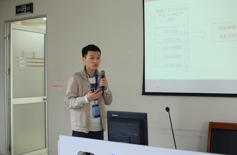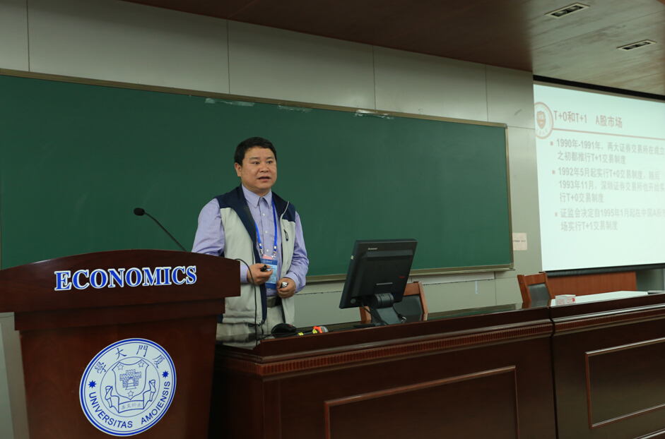 随后,研讨会正式拉开序幕,在两个分会场同时进行。第一分会场的报告主题为“衍生品市场”,由天津大学熊熊教授主持。第一位报告的是厦门大学陈坚副教授,他的文章关注于如何挑选出波动率平面中最能反应信息的因子,精彩的演讲后天津大学张维教授就预测的更微观解释与报告者进行了深入交流;第二位进行报告的是来自厦门大学的戴平生教授,他的报告题目是基于基尼平均差方法的上证50股指期货套保研究,研究也发现使用离散数据的基尼平均差方法更优于传统基尼平均差方法;第三位报告的是天津大学的熊熊教授,他报告的论文主题是现货市场t+1交易制度对期现的影响,主要介绍了计算金融实验。文章运用计算机建模技术,构建仿真金融平台,模拟真实金融市场投资者微观行为和订单流特征,发现t+0交易制度提高了股票市场的价格发现效率与市场流动性。