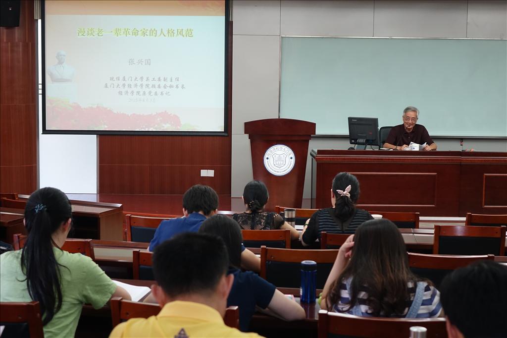 随后,张兴国从五个方面详细解读了老一辈革命家的人格风范:第一,高尚纯洁的道德情操;第二,严守纪律的大局观念;第三,廉洁奉公的公仆精神;第四,敢于担当的使命意识;第五,坚定不移的理想信念。他还结合毛泽东、周恩来、邓小平、叶剑英、黄克诚等老一辈革命家的事迹,引用《习近平谈治国理政》和“重要讲话”等精辟论述,以及经济学院和王亚南经济研究院在过去发展中出现的先进事例,生动、深刻地展示了崇高的人格风范的重要性。