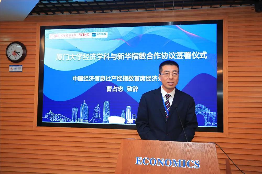中国经济信息社产经指数首席经济分析师曹占忠致辞,他提到,厦门大学经济学科是名副其实的中国经济学国际学术交流重要高地,此次推出全球汇率传导指数,是新华指数和厦门大学经济学科的一次合作尝试,未来新华指数将与厦门大学经济学科展开产学研结合的全面合作。