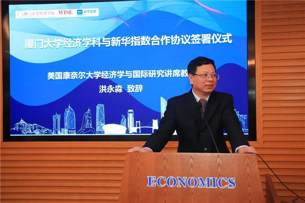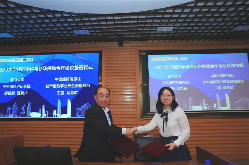 随后,中国经济信息社新华指数事业部金融指数部副总监王蜜和厦门大学经济学院教授、王亚南经济研究院副院长周颖刚分别代表双方签字。