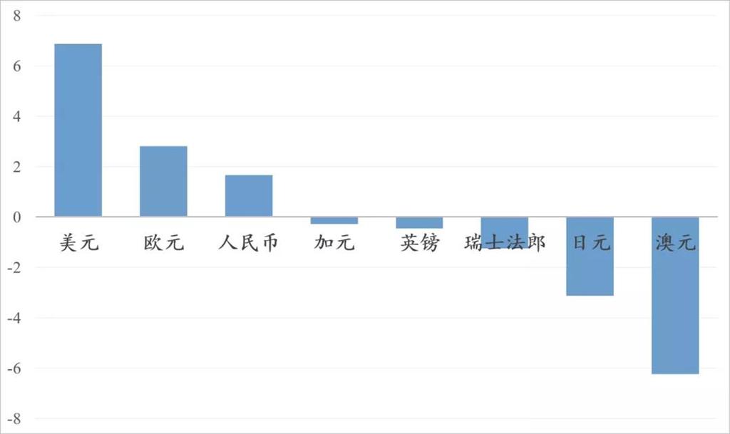 从汇率传导指数来看,在世界八种主要货币体系中,对其他货币汇率波动有正向净影响的货币只有三种,分别是美元、欧元和人民币。其中美元汇率传导指数达到6.86,美元汇率变动一个标准差,会影响其他七种货币汇率平均波动6.86个基点。人民币汇率传导指数为1.654,表现出较好的锚货币特征。