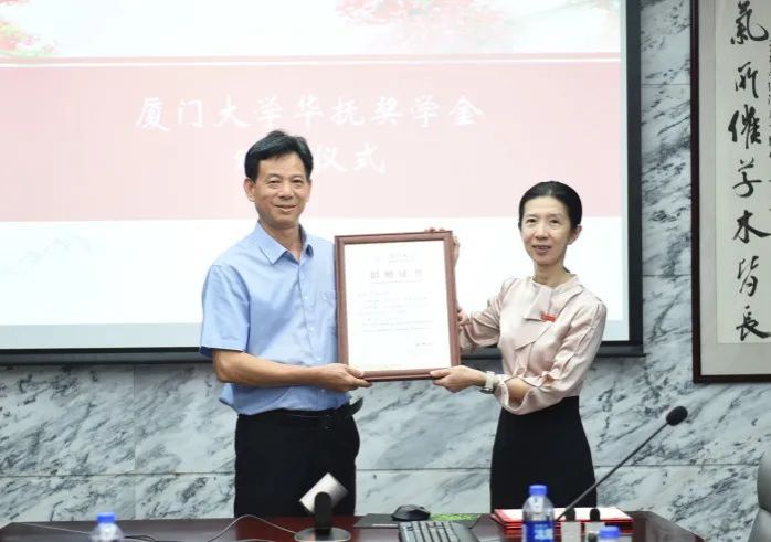 6月23日,厦门大学华抚奖学金颁奖仪式在经济楼N501举行,厦门大学王亚南经济研究院牛霖琳副院长主持仪式并向华抚教育基金颁发捐赠证书。
