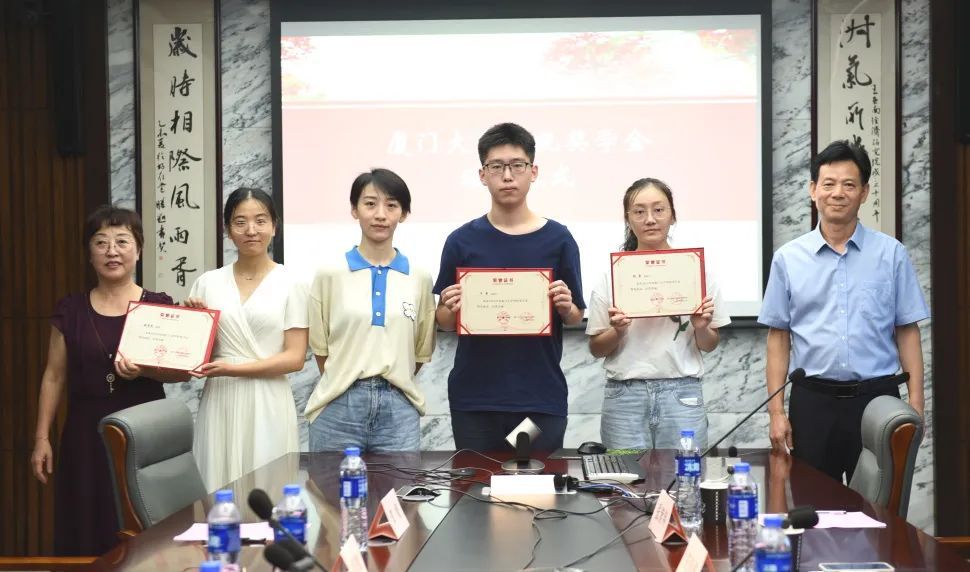 厦大王亚南经济研究院2019级硕士生张紫荆,经济学院2019级本科生牛童,经济学院2019级本科生彭景获得首届厦大华抚奖学金,华抚教育基金代表谢建华、林思抚、林圣燕向获奖同学颁发荣誉证书。三名获奖同学随后发表获奖感言,他们表示要将不负期望,努力进取,争取将学长感恩母校、回馈社会的精神发扬下去。