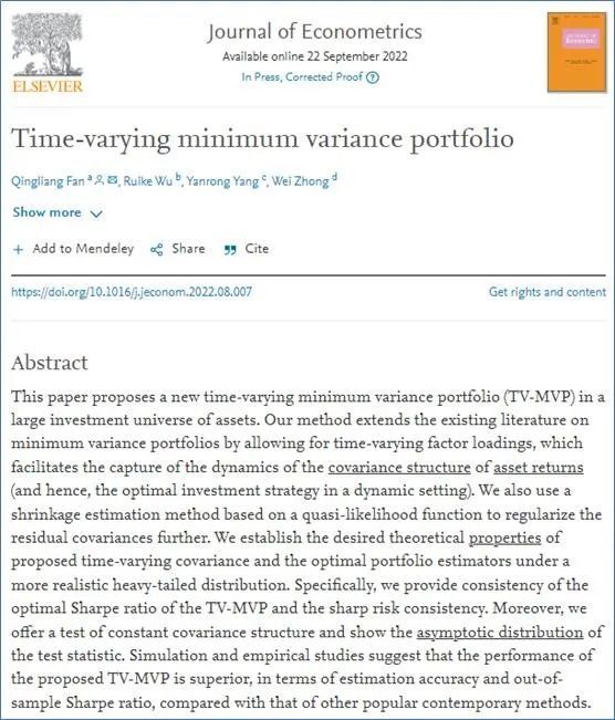 近日,厦门大学经济学院金融系金融工程专业2019级博士生(直博生)吴睿珂和香港中文大学范青亮教授、澳大利亚国立大学杨艳荣教授以及厦门大学王亚南经济研究院和经济学院统计学与数据科学系钟威教授合作完成的学术论文“Time-varying minimum variance portfolio”被Journal of Econometrics正式接受并在线发表。Journal of Econometrics是学界公认的计量经济学和统计学领域权威期刊,也是我校认定的国际A类期刊。