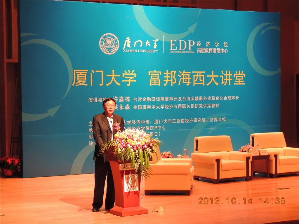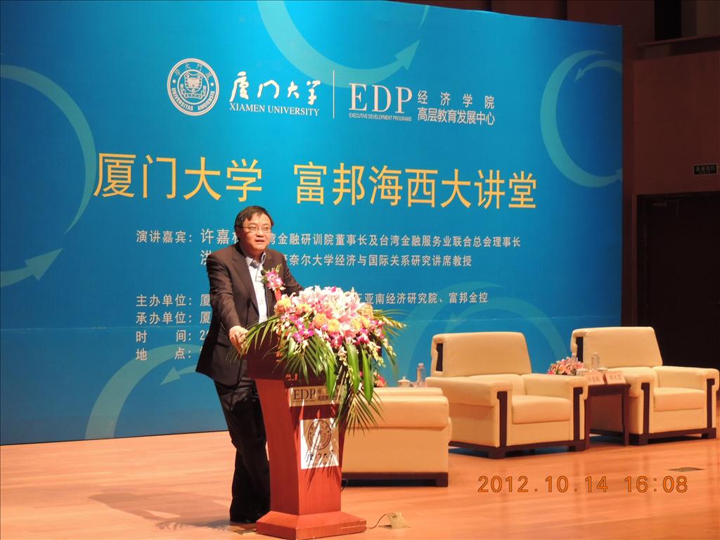 10月14日下午,经济学院EDP中心在福州市福建大剧院音乐厅隆重举办“厦门大学富邦海西大讲堂”。本次活动是该讲堂2012年度的第二场大型活动,由厦门大学经济学院、王亚南经济研究院和台湾富邦金控联合主办,经济学院EDP中心承办。台湾金融研训院董事长许嘉栋、美国康奈尔大学Ernest S. Liu经济学与国际研究讲席教授洪永淼分别作题为“全球化下的经济金融变局”、“从国际视角看中国经济增长模式的转变”的演讲。
