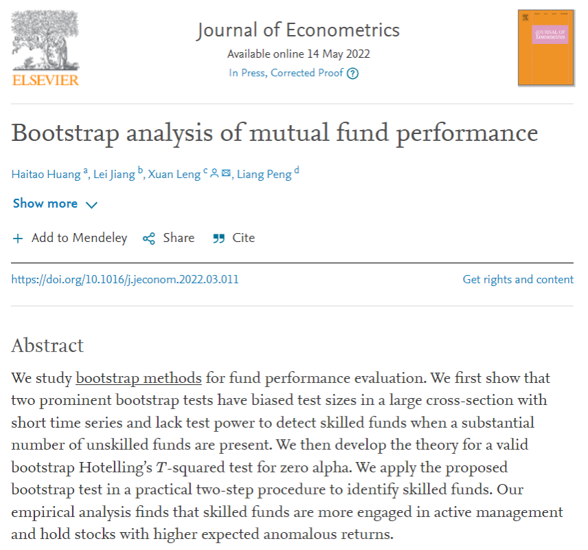 近日,经济学科青年教师冷旋助理教授,与南开大学金融学院黄海涛助理教授、清华大学经济管理学院姜磊副教授、佐治亚州立大学商学院彭亮教授合作的题为“Bootstrap Analysis of Mutual Fund Performance”的论文在计量经济学权威刊物Journal of Econometrics上在线发表。
