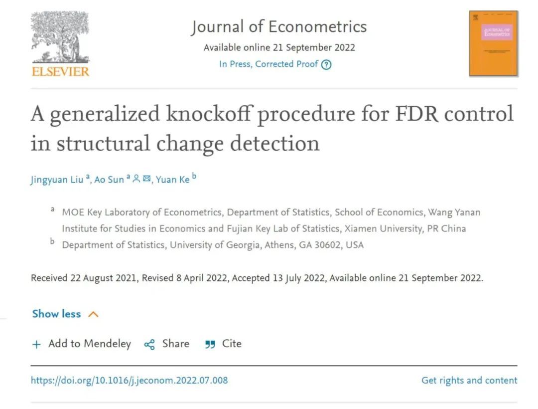 近日,经济学院统计学与数据科学系与王亚南经济研究院刘婧媛教授与其指导的2020级博士生孙傲,以及美国乔治亚大学柯源助理教授合作的题为“A generalized knockoff procedure for FDR control in structural change detection”被Journal of Econometrics正式接受并在线发表。Journal of Econometrics是学界公认的计量经济学和统计学领域权威期刊,也是我校认定的国际A类期刊。