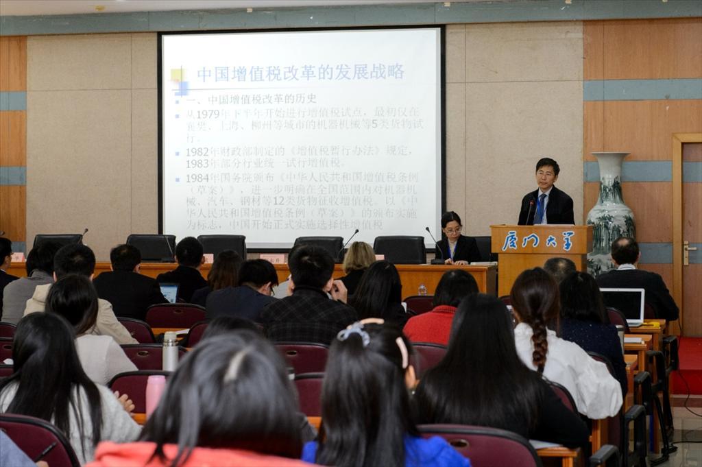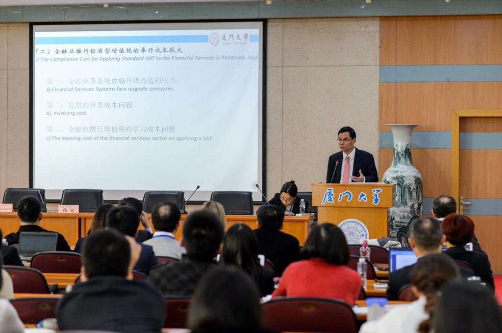 本次研讨会的主题是“中国增值税改革回顾”,主要关注“中国服务业营业税改为增值税的经济效应分析和制度设计”。研讨会为期一天半,举办了六个场次的嘉宾演讲和研讨。厦门大学经济学院党委书记雷根强教授出席会议并在开幕式上致辞。国家税务总局税收科学研究所副所长靳东升研究员和厦门大学副校长、经济学院财政系杨斌教授分别做了《中国增值税改革的发展战略》和《中国金融业“营改增”路径的现实选择》的主题发言。靳东升从现代型增值税的优点出发,分析了中国增值税的特点,提出了中国需要不断完善增值税税制改革的现状。靳东升认为一个广覆盖、低税负、简税制、严征管的现代型增值税体系将会在中国出现,最终实现增值税的现代化和优化。杨斌首先综述了国际上有关金融业应否征收标准增值税的争论和实践以及国内学者的不同观点,然后深入浅出地分析了中国金融业的特殊性和其“营改增”存在的难点。杨斌提出在金融业推行标准增值税不可行的观点,并强调金融业“营改增”应遵循中性原则和保持原税负不变原则。基于金融业可能无法实行凭发票抵扣进项税额的方法,杨斌提出采用“账簿法”的解决方案,并通过实证测算了两套方案的税收负担及可行性,对当前金融业“营改增”试点提供了很有价值的参考。嘉宾们的主题发言为大会的研讨奠定了总体基调。