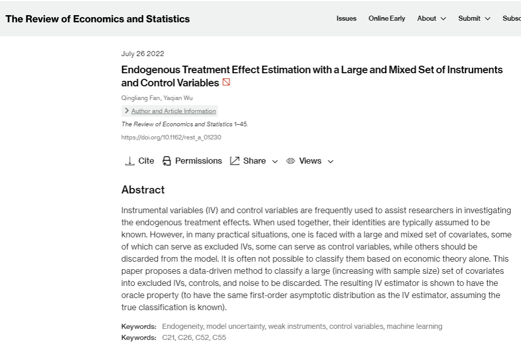 近日,由经济学院统计学与数据科学系统计学专业2019级博士生武亚倩与香港中文大学范青亮助理教授合作的题为 “Endogenous Treatment Effect Estimation with a Large and Mixed Set of Instruments and Control Variables ”的论文于国际权威期刊The Review of Economics and Statistics在线发表。该期刊是学界公认的经济学与统计学国际权威期刊,也是我院认定的经济学与统计学国际A期刊(国际一类)。