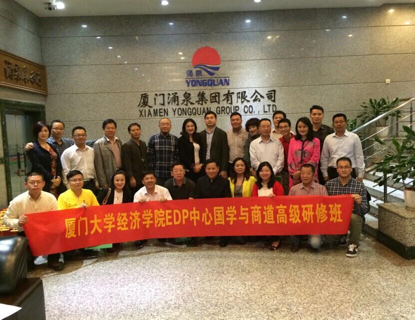 2014年11月12日下午应厦门涌泉集团有限公司董事长赖桂勇同学的盛情邀请,经济学院EDP中心首期国学与商道高级研修班(以下简称“国学班”)20多名同学前往位于灌口的涌泉创业园参访。
