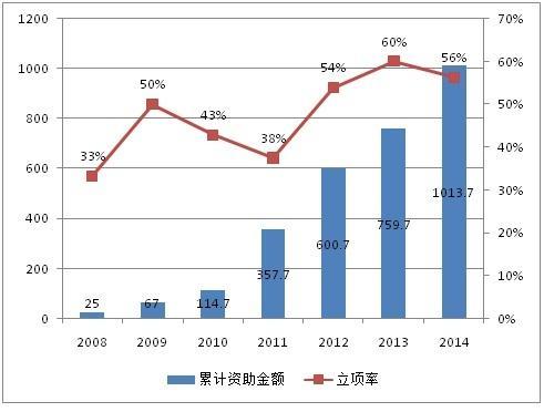 WISE2008-2014国家自然科学基金累计资助金额与年度立项率