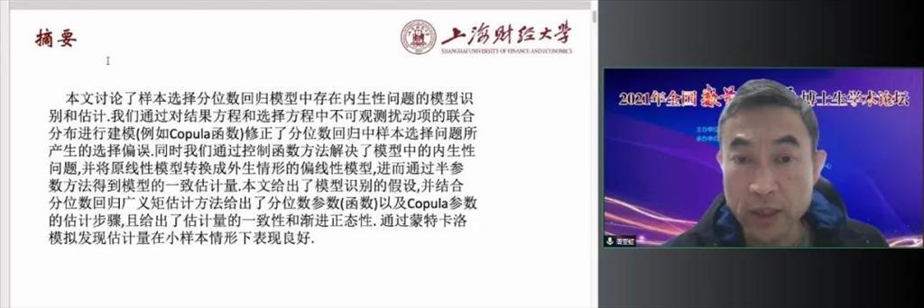 12月25日-26日, “2021年全国数量经济学博士生学术论坛”以线上会议形式成功举办。两天的议程中共有8位相关领域的资深学者带来三场主题演讲,同时共安排三场分组报告会,设14个线上会场,来自北京大学、清华大学、中国人民大学、南京大学、浙江大学、东北财经大学、厦门大学、英国利物浦大学等国内外知名高校的四十余名博士研究生宣读论文。