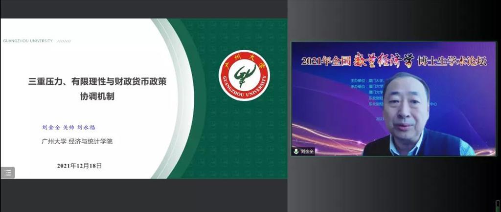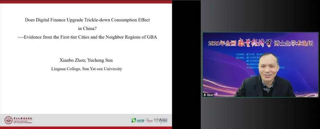 第二场主题演讲由厦门大学经济学院郑挺国教授主持,广州大学刘金全教授、上海财经大学周亚虹教授、中山大学周先波教授先后作题为“三重压力、有限理性与财政货币政策协调机制”、“内生情形下分位数选择模型的识别和估计”、“Does digital finance upgrade trickle-down consumption effect in China? ---Evidence from the first-tier cities and the GBA neighboring regions”的报告。