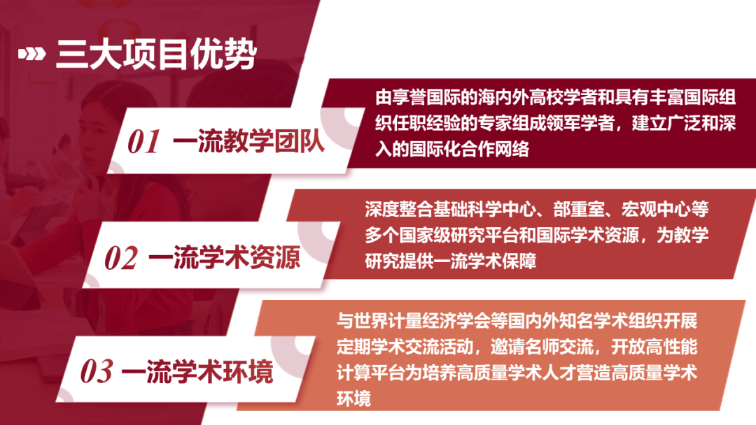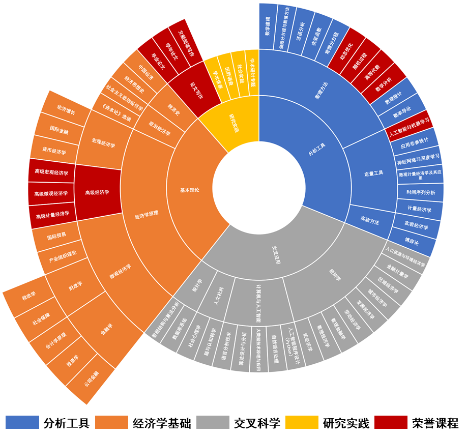 课程体系在兼顾通识和基础的同时,加强对于计量经济学等定量分析工具的学习,加强对于中国经济实践的理解,加强对研究兴趣和研究能力的培养。体现了习近平总书记提出的充分借鉴和利用先进研究方法,同时不忘老祖宗,保持科学判断力的要求。