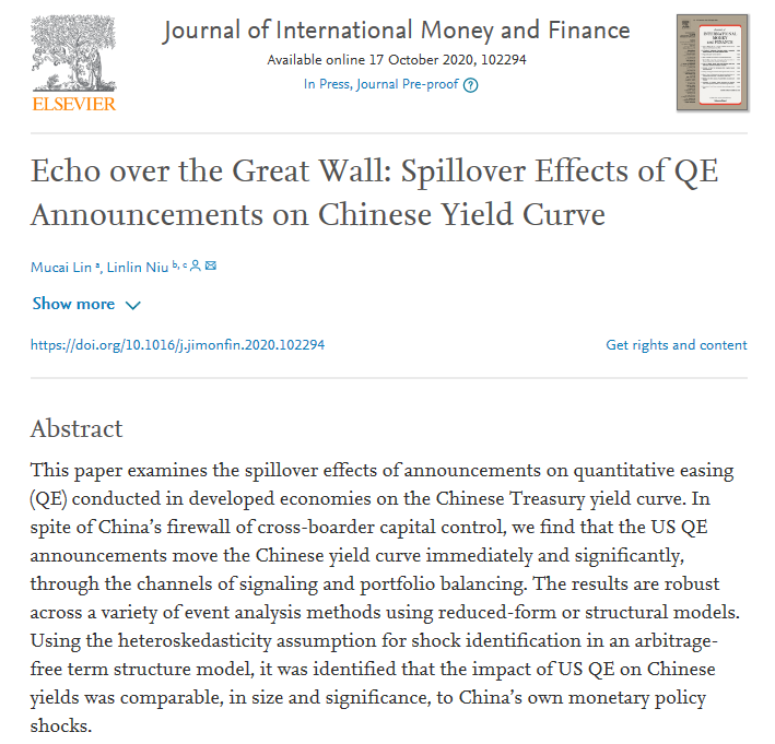 近日,WISE牛霖琳教授与华侨大学林木材讲师(WISE 2018届博士毕业生)合作的论文“Echo over the Great Wall: Spillover Effects of QE Announcements on Chinese Yield Curve”在线发表于Journal of International Money and Finance。