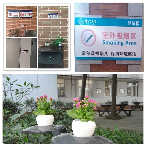 为了营造无烟经院,除了室内的禁烟标识,室外划定的吸烟区,学院还在烟灰缸上安置了盆栽