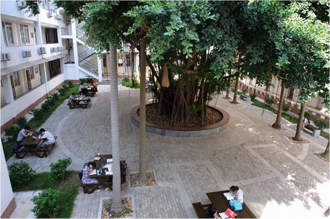 穿过经济楼的大堂,便来到了一处树木葱茏的庭院,在爬满藤蔓的棕榈树下掩藏着一排排平整的木桌椅,有几名学子正在这绿荫丛中安静地自习。微风吹动树影,树影摇碎阳光,好不惬意!谁能想到,这里曾经只有一棵老榕树、数颗棕榈树和一组石桌凳呢?一开始并没有多少人理会这个小处所,慢慢地大家开始思考:这本该是休闲好去处的绿地为何少人踏足?从这小小的问题出发,更加完善的修整方案就冒出来了。在一次对庭院的“花园化”整改中,经院一道把地下的排污管道也重修了一番,以往担心的积水和臭气的问题一并解决了,一举多得。