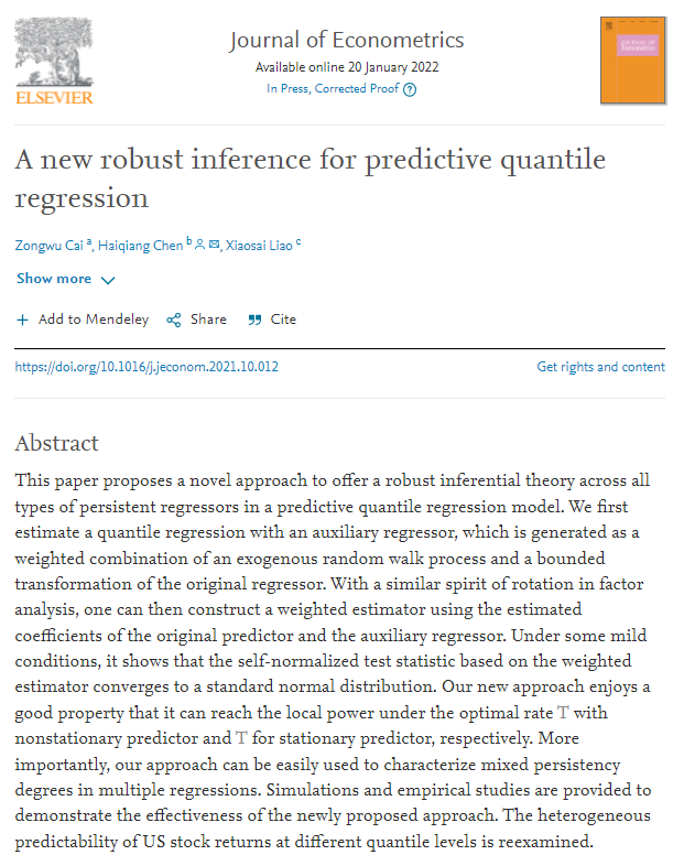 近日,WISE与经济学院金融系陈海强教授,和堪萨斯大学蔡宗武教授,WISE 2018届博士毕业生、西南财经大学廖小赛助理教授合作的题为“A New Robust Inference for Predictive Quantile Regression”的论文在计量经济学权威期刊Journal of Econometrics上在线发表。