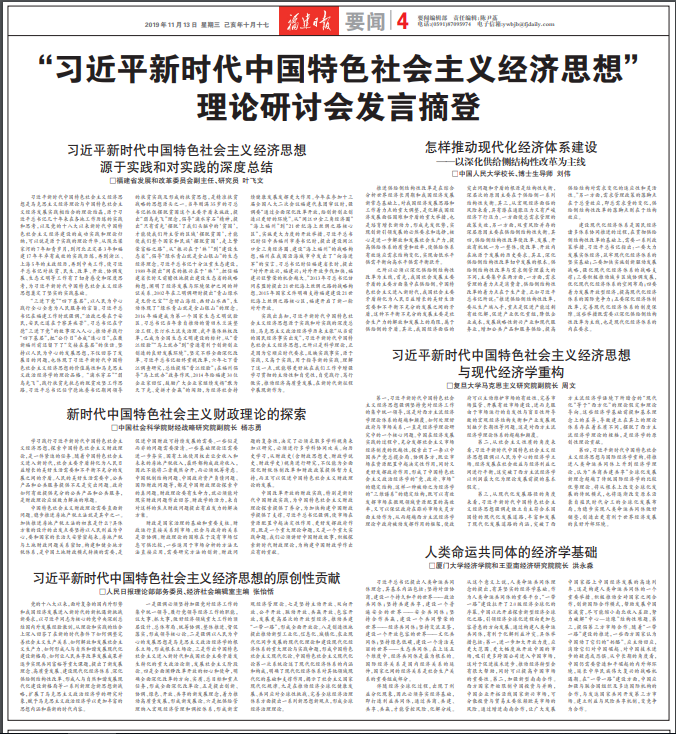 11月13日,《福建日报》第四版刊登了习近平新时代中国特色社会主义思想理论研讨会发言摘登一文,该文对2019年6月22日由福建省发展和改革委员会、厦门大学经济学院、王亚南经济研究院举办的学习践行习近平新时代中国特色社会主义思想理论研讨会部分嘉宾的发言进行了摘登。内容包括:福建省发展和改革委员会副主任、研究员叶飞文的“习近平新时代中国特色社会主义思想源于实践和对实践的深度总结”;中国人民大学校长、博士生导师刘伟的“怎样推动现代化经济体系建设 ——以深化供给侧结构性改革为主线”;中国社会科学院财经战略研究院副院长杨志勇的“新时代中国特色社会主义财政理论的探索”;复旦大学马克思主义研究院副院长周文的“习近平新时代中国特色社会主义思想与现代经济学重构”;人民日报理论部部务委员、经济社会编辑室主编张怡恬的“习近平新时代中国特色社会主义思想的原创性贡献”以及洪永淼教授的“人类命运共同体的经济学基础”。