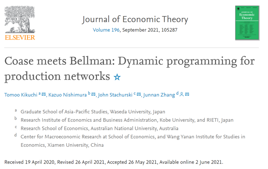 近日,经济学院宏观经济研究中心与王亚南经济研究院(WISE)2021年双聘助理教授张钧南与早稻田大学Tomoo Kikuchi 、神户大学Kazuo Nishimura 、澳大利亚国立大学John Stachurski合作完成的论文“Coase meets Bellman: Dynamic programming for production networks”在经济理论国际顶级期刊Journal of Economic Theory(2021.Vol.196,105287)正式发表。