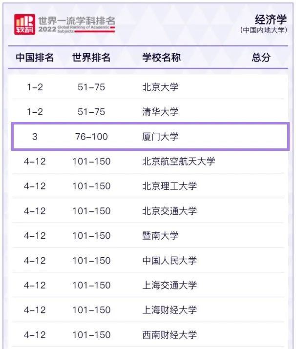 厦大经济学科的“经济学”世界排名为76-100,中国内地大学排名第3;“统计学”世界排名为101-150,中国内地大学排名为并列第6;“金融学”世界排名为101-150,中国内地大学排名为并列第7。