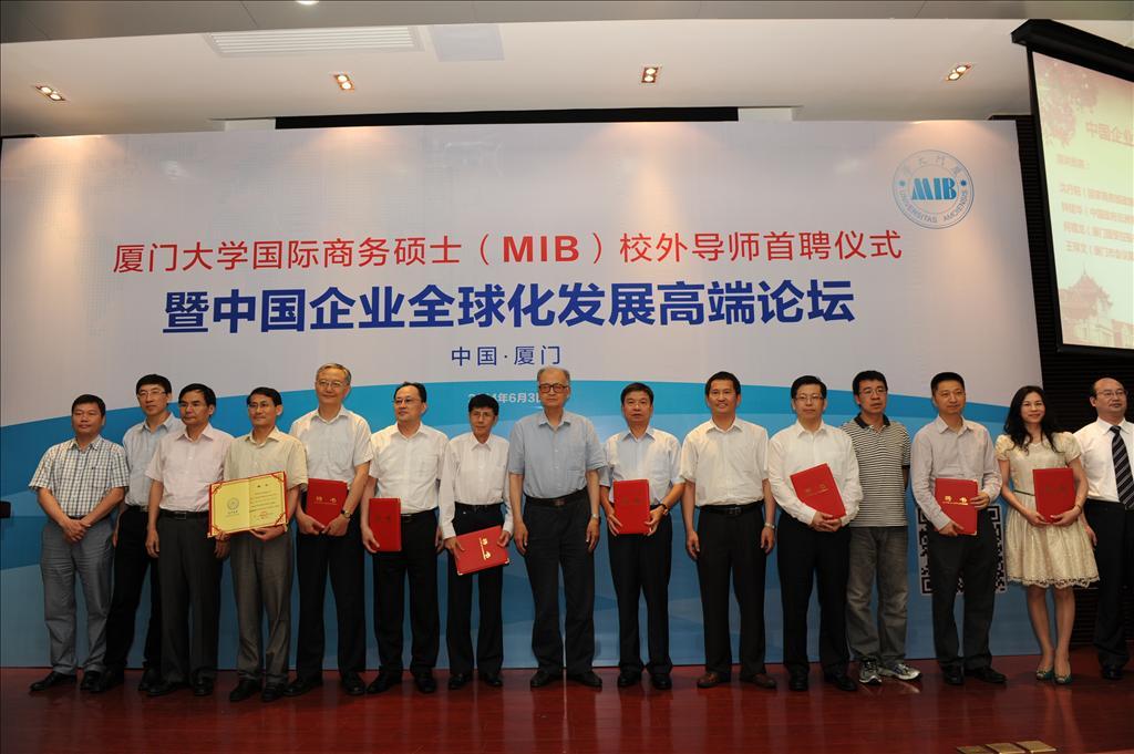 在厦门大学MIB校外导师首聘颁证仪式上,中国社会科学院特聘顾问王洛林、厦门大学副校长杨斌以及厦门大学人事处处长吴立武、研究生院副院长陈工、社科处副处长张明志、经济学院党委书记雷根强、经济学院副院长朱孟楠、经济学院党委副书记邱旺土作为颁证嘉宾为首批受聘的MIB校外专家颁发证书。本着培养理论与实践技能并重的高级国际商务专业人才的目标,厦门大学MIB首批聘任了商务部政策研究室主任、商务部新闻发言人沈丹阳,中国政府非洲事务特别代表、中国驻南非前任大使钟建华,厦门市商务局副局长、会议展览事务局局长王琼文,厦门国贸控股有限公司董事长、国贸集团股份有限公司董事长何福龙,全国政协委员、厦门恒兴集团有限公司董事长柯希平,厦门金圆投资集团有限公司董事长、厦门国际金融管理学院董事长许晓曦,厦门国贸集团股份有限公司副总裁高少鏞,厦门建发股份有限公司总经理郑永达,以及厦门嘉晟集团有限公司董事长李冬敏等9名国际商务领域的学者型领导及企业高管作为校外导师,以“双导师制”的方式帮助MIB学员提高国际商务实践技能,这也是厦门高校中首次提出的一种创新性高端人才培养方式。